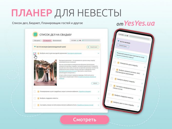 Чтобы не забыть ни одной важной мелочи в свадебной подготовке, воспользуйся нашим Списком дел невесты. Мы создали пошаговый план, который поможет тебе самостоятельно организовать свадьбу своей мечты. Детальные инструкции, удобный интерфейс и важные советы от экспертов – все, чтобы сделать твою подготовку к свадьбе проще