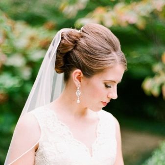 Традиционным украшением на голове невесты обычно выступает фата. Она может быть длиной в пол или, наоборот, укороченной. Подобный аксессуар можно использовать с волосами любой длины, сделав классическую «ракушку» под него. Однако современные невесты чаще всего заменяют этот символичный атрибут ободками или диадемами.