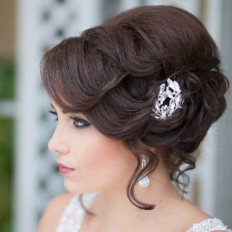 Девушки предпочтут естественность, следовательно, кудри нужно будет осторожно разобрать руками и слегка расчесать. После этого тонкие пряди у висков заправляют назад и закалывают