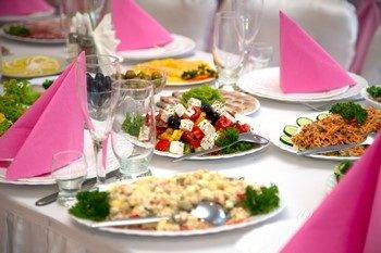 - Пока гости находятся на мероприятии, столы ломятся от разнообразия блюд – оригинальных закусок, необычных горячих блюд, всевозможных салатов. Считается нормой, когда все приготовленные яства, сменяются в течении праздника, во время перерыва на танцы, конкурсы, общение. Чтобы блюда не стояли постоянно на столе, нужно рассчитать продолжительность банкета, и правильно распределить вынос и подачу приготовленных блюд, тогда даже при использовании небольшого количества рецептов будет иллюзия разнообразия.