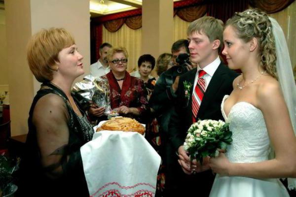 Следующим моментом, когда звучат слова напутствия молодоженам от родителей, считается встреча уже расписанных супругов с хлебом и солью. Обычно данное действие происходит перед входом в ресторан или кафе, где предполагается торжественное застолье в честь свадьбы. Происходит все это следующим способом: молодые приезжают, выходят, их встречают родители, которые несут хлеб и соль на полотенце, небольшую икону богородицы.