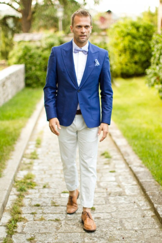 Если свадьба проводится на природе или в другом неформальном месте, то пиджак можно комбинировать с шортами и джинсами.