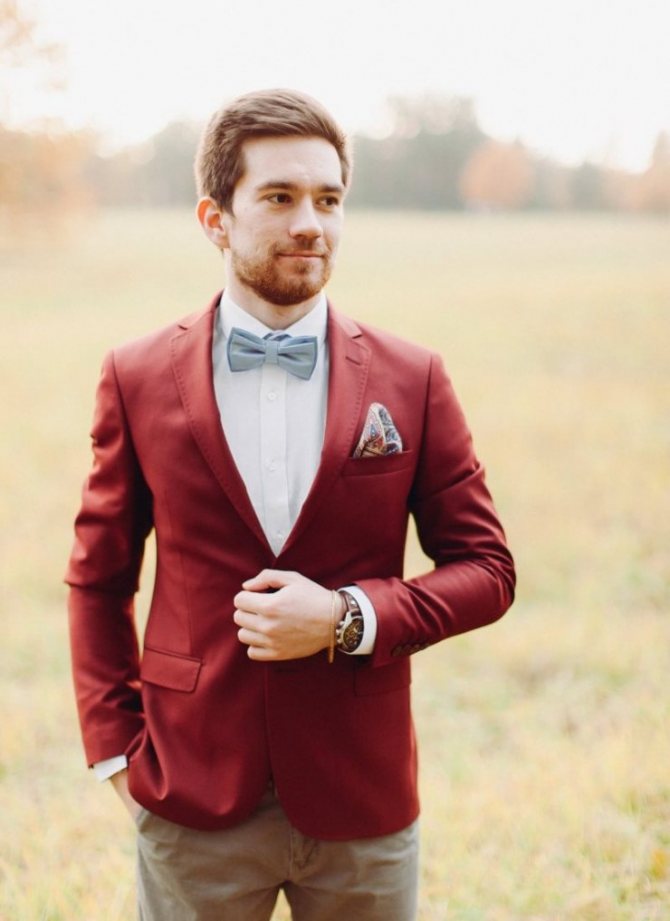 Следует обратить внимание на насыщенные цвета. Сейчас в моде фиолетовые и вишневые оттенки. Яркий пиджак, сшитый из материала со сложной фактурой и украшенный интересными принтами, станет центральной темой для обсуждения среди собравшихся на торжество гостей.