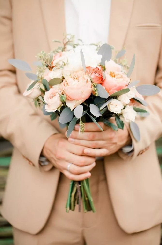 Будущий муж может надеть на свадьбу классический однотонный костюм светло-коричневого, песочного, белого цвета. Дополнить образ стоит бабочкой или галстуком бежевого, кораллового тона, а также запонками. Рубашка должна быть белой.