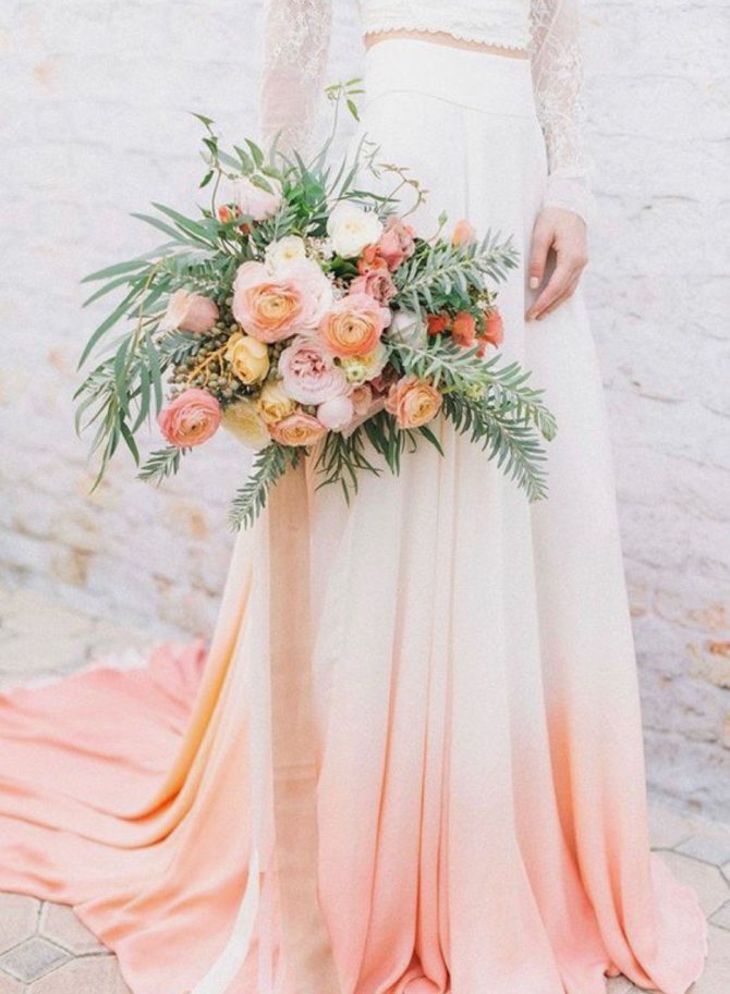 Вне зависимости от типажа, наряды жениха и невесты в персиковом цвете подойдут всем. Особенно привлекательно в нем будет выглядеть женщина. Он не вызовет отторжение, а наоборот, подчеркнет красоту невесты. Свадебное платье в подобном стиле выглядит очень нежно, воздушно, романтично, ничуть не уступая привычному белому.