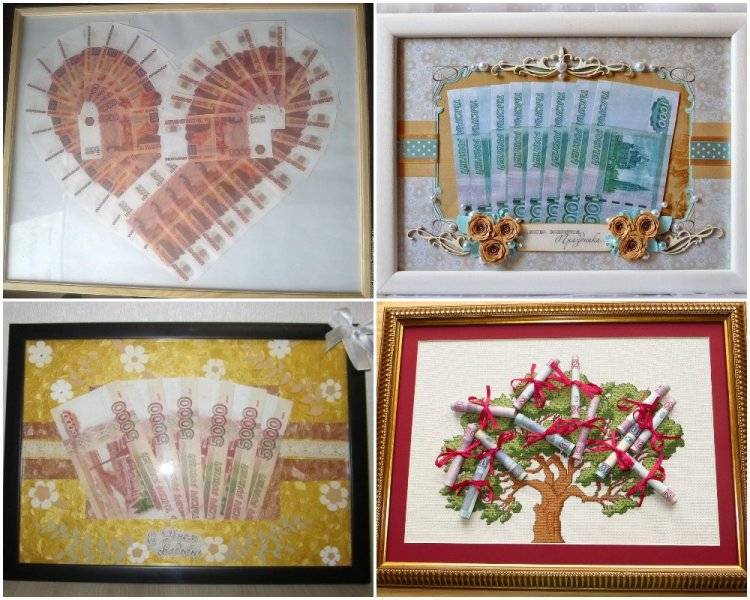 - Картина с деньгами – красивый способ поздравить молодоженов и вручить им свой подарок. Можно сделать необычный коллаж в виде корабля, на мачте которого вместо парусов будут купюры. При вручении скажите молодым свое напутствие: «Пускай ваше семейное судно не знает штормов-ссор и бурь-разочарований, и сопровождают вас только солнышко радости, облака надежды и море денег».