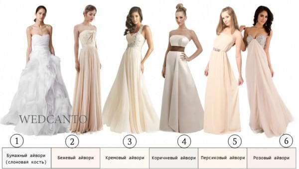 - Создание благородства стиля. По сравнению с белоснежным изделием, айвори предполагает более теплые, активные оттенки. Они моделируют идеальный фасон и вид платья;