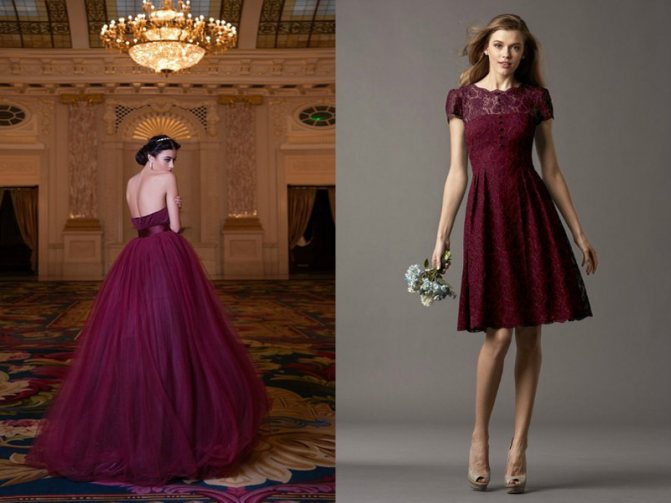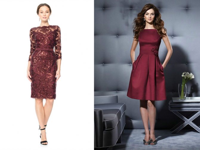 Для молодежных вечеринок подойдут короткие платья цвета марсала с преобладанием красного тона. Это может быть модель, в котором лиф выполнен в виде корсета, с пышной многослойной юбкой из шифона. Дополнять наряд стоит деталями белого или черного цвета.