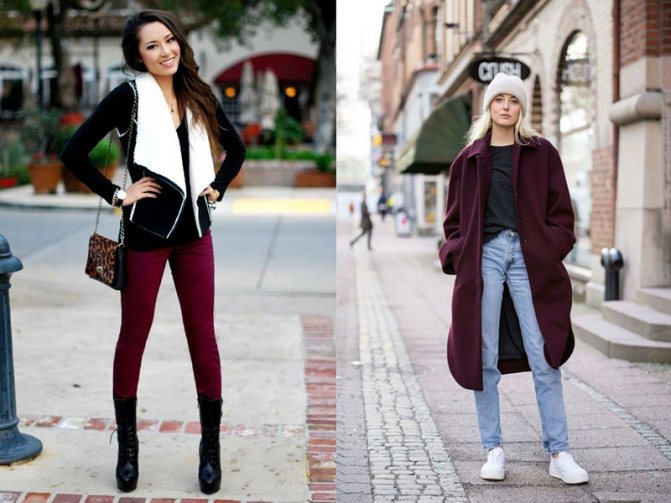 Заметной деталью повседневного лука сможет стать любая деталь туалета красно-коричневого оттенка. Например, узкие джинсы или классические брюки оттенка марсала можно носить со свитерами или рубашками любого подходящего оттенка. Обувь можно подобрать в тон к джинсам или топу.