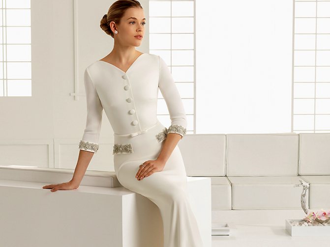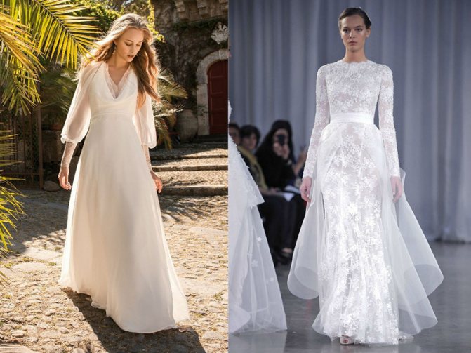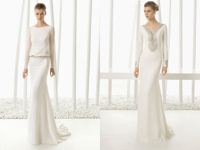 Элегантные наряды, сдержанные и изысканные одновременно, выглядят очень соблазнительно. Они актуальны не только для венчания в церкви, но и для гражданской церемонии.