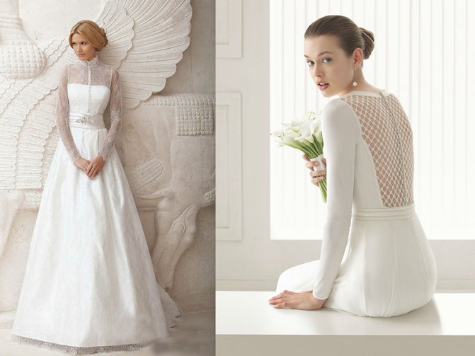 Если свадьба проходит в холодный период года, то выбор закрытого наряда с рукавами кажется логичным. Зимой обнаженные плечи будут неуместны, так как даже в меховой шубке невеста будет мерзнуть, особенно, если запланирована длительная прогулка.