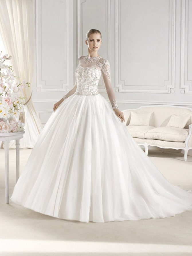 Закрытые платья могут иметь те же фасоны, что и декольтированные бальные платья, но зона декольте, плечи и руки в таких нарядах закрыты кружевными вставками. Возможен и другой вариант – глухой лиф, длинные рукава и кружевная вставка на спине.