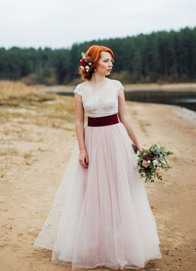 Для деревенского свадебного платья наиболее оптимальны светлые оттенки. Традиционный белый цвет уступил пальму первенства молочному и бежевому. Они эффектно смотрятся на невестах с загорелой кожей. Иногда встречаются наряды в розовом и персиковом оттенке. Яркие тона будут неуместны.