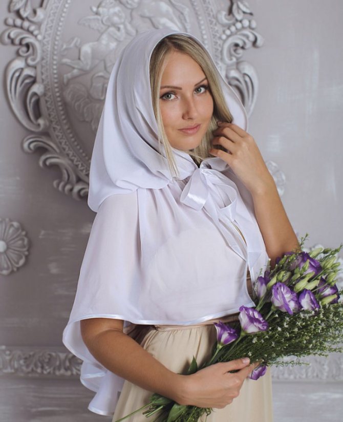 Сшитый специально для посещения церкви, платок должен покрывать голову и плечи, слегка ниспадая на лоб и щеки.