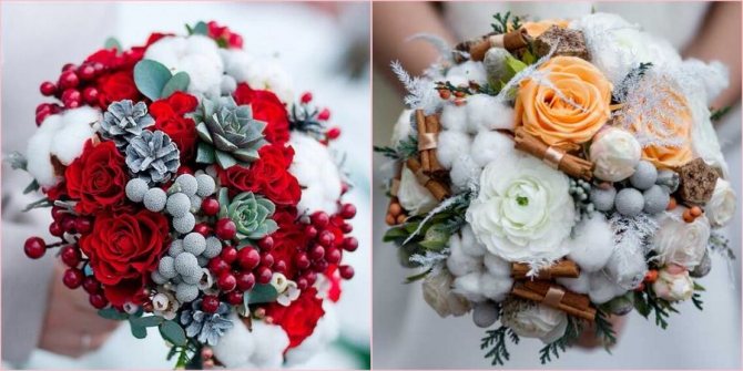 Для свадебного букетика нужно подбирать цветы, которым нестрашны морозы, таковыми являются орхидеи, каллы и анемоны. Оригинально выглядят композиции с дополнением шишек и еловых веток.