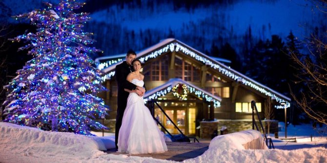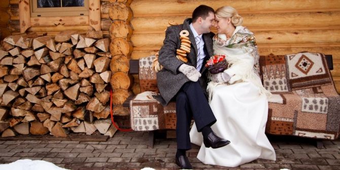 Самый распространенный вариант сценария зимней свадьбы – приверженность русским традициям. Невеста в этом случае предстает славянской красавицей с длинной косой и румянцем на щеках, а жених – не менее привлекательным смелым юношей. Можно организовать тематические развлечения и фотосессию – катание на санях или повозке с лошадьми, чаепитие из самовара с баранками и многое другое.