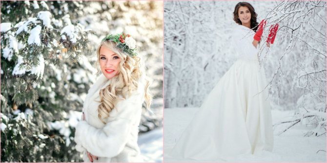 Большинство невест отдают предпочтение закрытым длинным платьям, но есть и немало девушек, которые выбирают откровенные наряды, например, в стиле ампир, дополняя их меховыми аксессуарами. Главное, чтобы они были подобраны со вкусом и не выбивались из общего стиля.
