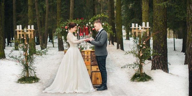 Еще один вариант сценария – зимняя свадьба в стиле сказки, например о Снежной королеве. В этом случае невеста предстает утонченной и холодной леди, но ее сердце постепенно оттаивает от пылкой любви жениха. В этом случае будет уместным празднование в домике посреди хвойного леса или даже на открытом катке, а фотосессию можно устроить на фоне ледяных фигурок.