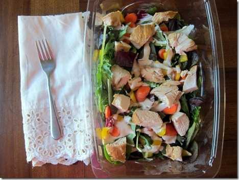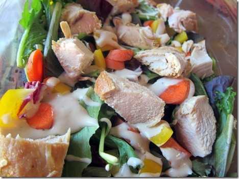 Мой салат состоял из смешанной зелени, остатков курицы, желтого перца, моркови и йогуртовой заправки «Цезарь».