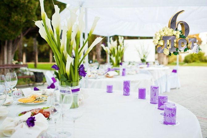 Для оформления Вашей годовщины используйте белые, фиолетовые и бирюзовые оттенки, что касается цветов, то флористы рекомендуют украсить праздничное помещение каллами.