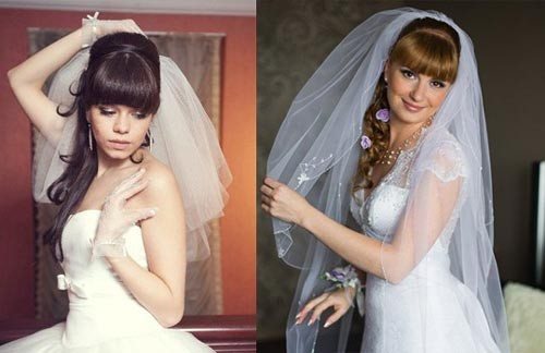 Причёска с фатой и чёлкой также может быть потрясающе красивой, если невеста подберёт правильный вариант. Это могут быть локоны, распущенные или собранные, высокие причёски или собранные на затылке.