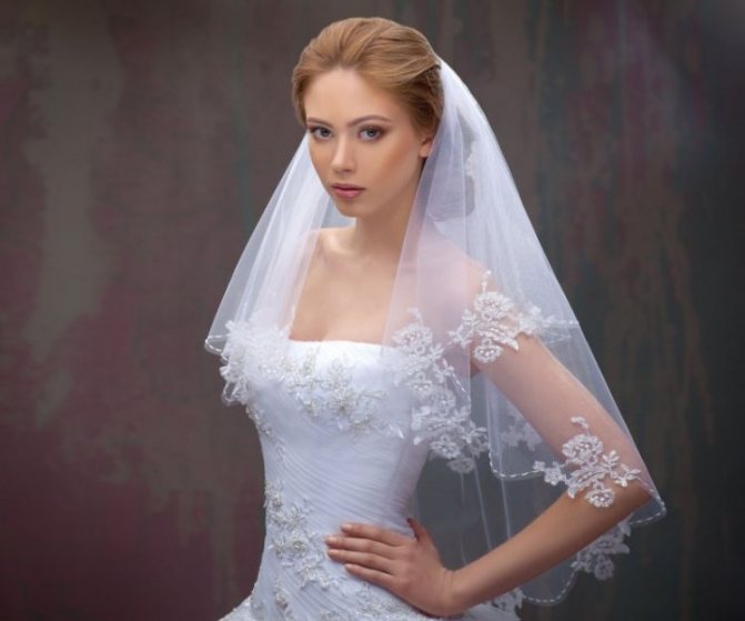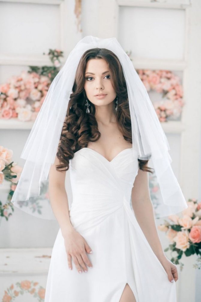 - Длина до плеч – к такой фате лучше всего подобрать элегантную и лаконичную причёску