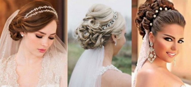 Для нарядности подбирается правильная фата и различные украшения для волос.