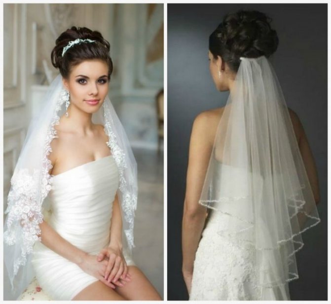 На такую длину идеально подойдёт причёска с длинной фатой и фатой средней длины.