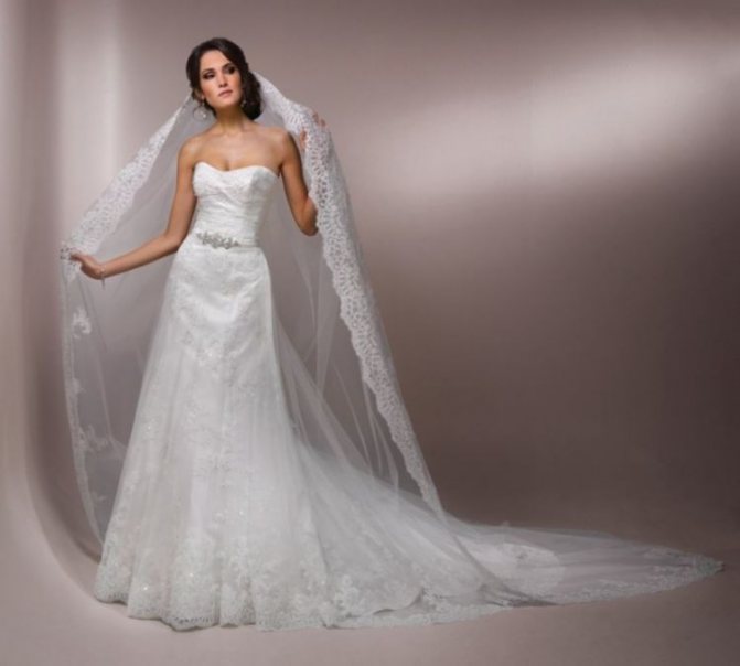 - Фата в пол – идеально сочетается с платьем со шлейфом, выглядит очень торжественно и красиво