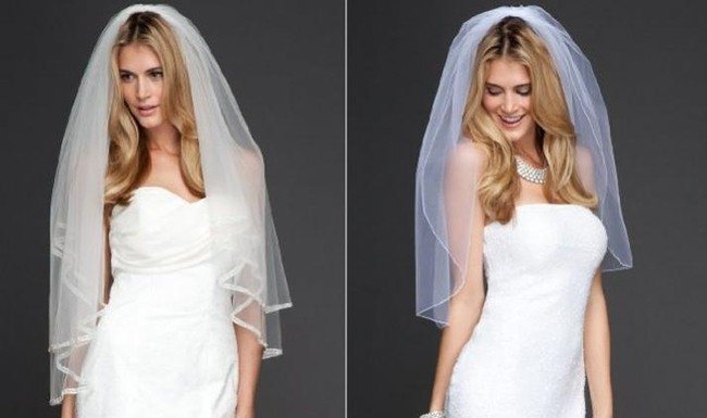 - Фата с короткой длиной отлично подходит для коротких свадебных платьев с корсетом, она добавит шарма и кокетливости