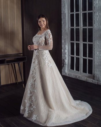 - Превосходно подойдет модное свадебное платье с рукавом. Только рукава должны быть длиной не меньше 3/4, потому как более короткие и объемные привлекут внимание к плечам.