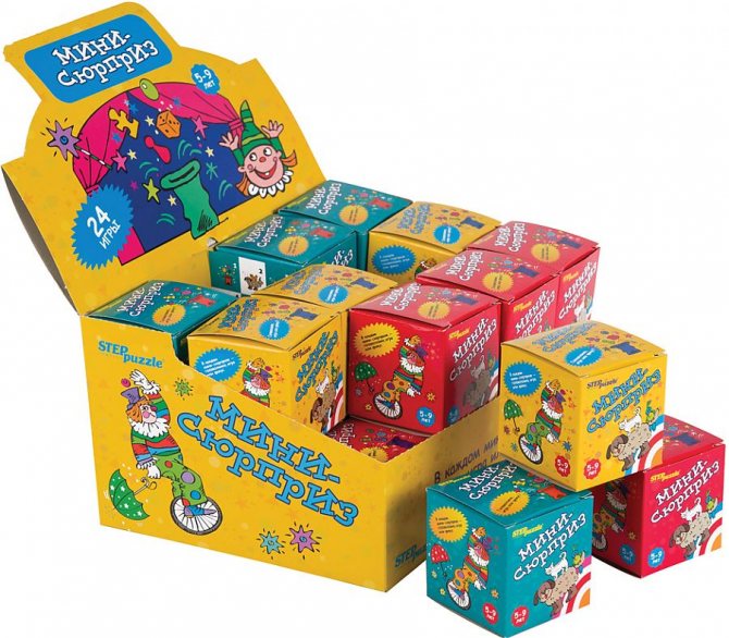 Мини-сюрпризы в индивидуальных цветных коробках спасут положение и удивят необычным наполнением даже взрослых! В каждом мини-сюрпризе — миниатюрные настольные игры, карты, фокусы, викторины, головоломки или пазлы. Возьмите их в дорогу, в гости или на пикник. Мини-сюрприз представлен в ассортименте, всего 24 разнообразных игры, с которыми в любой детской компании будет весело и интересно! Размер коробочки: 7х7 см. Возраст: от 5 до 9 лет. Цена: 40 ₽