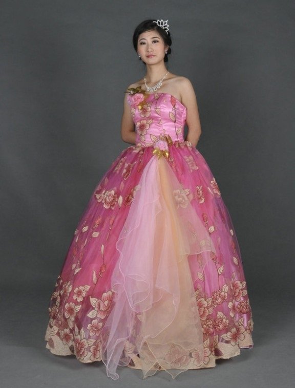 Именно бальное розовое платье на свадьбу выбирают чаще всего. Модель считается традиционной. В данном случае юбка уместна как многослойная, так и состоящая из нескольких слоев. В первом случае объем изделию придается с помощью подъюбника, оснащенного кольцами. В подобном наряде подчеркивается явная торжественность мероприятия, а девушка выглядит, как истинная принцесса. Дополнительный декор в виде цветов и кружев, позволяет сделать образ более оригинальным. Особо же эффектно смотрится одежда с пояском, позволяющая подчеркнуть все преимущества женского силуэта.