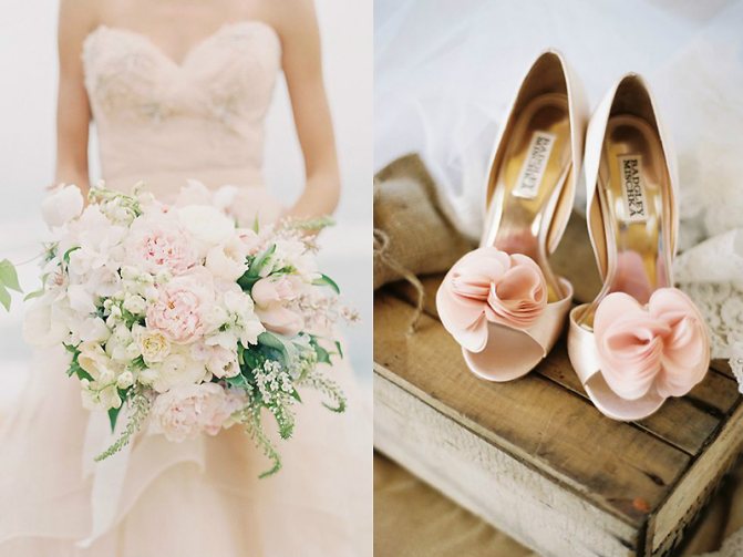 - Туфли – если невеста в белом одеянии может подобрать себе абсолютно любой вариант обуви, то вот розовая девушка должна более тщательно делать свой выбор. Лишь только элегантная и утонченная обувь будет красиво смотреться на ножке. Это могут быть лодочки, туфли на низкой шпильке и с удлиненным носом.