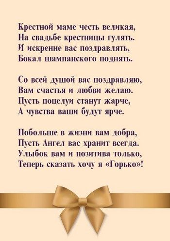 В день свадьбы вашей поздравленья От крестной мамы ты прими. Желаю счастья, и везенья, И вечной искренней любви.