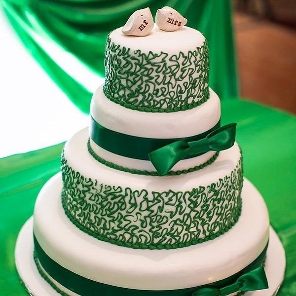 Сам свадебный торт рекомендуется выполнить в зеленых оттенках, а сверху дополнить символичными числами «55» и съедобной мастики. В конце вечера или перед разрезанием сладости пара может съесть числа каждый по штуке.