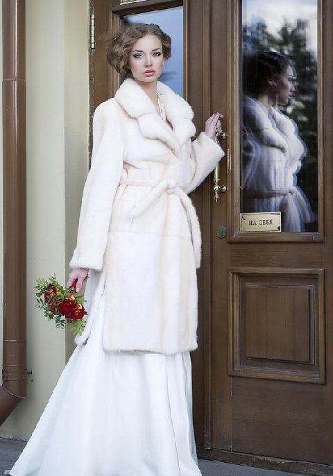 Какая длинна может подойти к свадебному наряду? Длина на ладонь ниже талии будет хорошим выбором в большинстве случаев. Добавить знатности образу получается у пальто из меха.