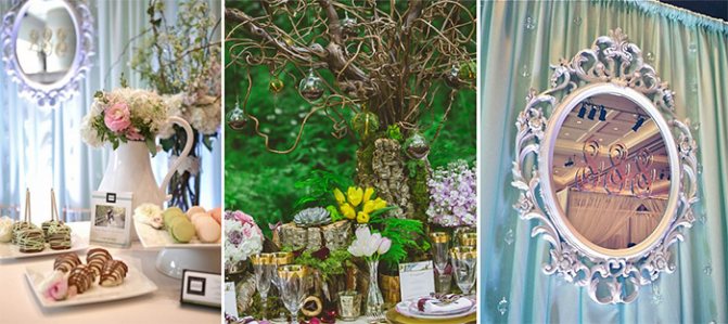 Тщательно обдумайте расстановку мелких предметов декора свадьбы: где будет лежать волшебная палочка и сказочное веретено из Спящей красавицы, стоять карета из тыквы и хрустальный башмачок Золушки, красные сапоги кота и мышки, волшебное зеркало и отравленное яблоко. Легко подобрать аксессуары, для этого главное прочесть сказку. В целом для атмосферы свадьбы подойдут легкие воздушные ткани для драпировки, обилие цветов, подсвечники.