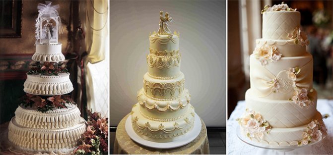 Жемчужиной стола, главным его украшением служит свадебный торт сказочного стиля. Гости должны быть сражены наповал шедевром кондитерского мастерства, который может быть оформлен в виде кареты, замка. Если вы предпочитаете более традиционные виды выпечки, то свадебный торт может быть большим и многоярусным, но не объемным, а верхушка его будет украшена фигурками сказочных принца и принцессы. Главная задача кондитера заключается в совмещении красоты и сказочного вкуса, для чего в тортах такой направленности используют безе и орехи, разные легкие кремы и мастику.
