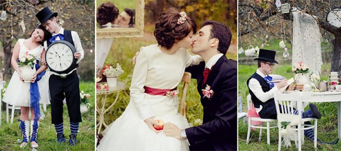 - «Алиса в стране чудес» – с самого утра жених и невеста отправляются в путешествие в Зазеркалье, когда к ним домой приходят герои сказки. Приглашенных в месте проведения торжества ждут разнообразные превращения, розыгрыши, сюрпризы. Пригласительные можете оформить в виде флешки или диска, где записано видео: приглашение сказочного стиля на чаепитие в графство Чеширского кота.