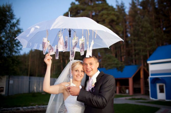 Можно положить купюры в красивый конверт-открытку и вручить с поздравлениями на торжестве. Но гораздо интереснее, если вручение денег пройдет в шутливой и юморной форме. Можно разыграть сценку, придумать театрализованное представление с переодеваниями, исполнить песню-переделку. Необычные поздравления запомнятся молодоженам, поднимут настроение и внесут веселую нотку в торжественное мероприятие.