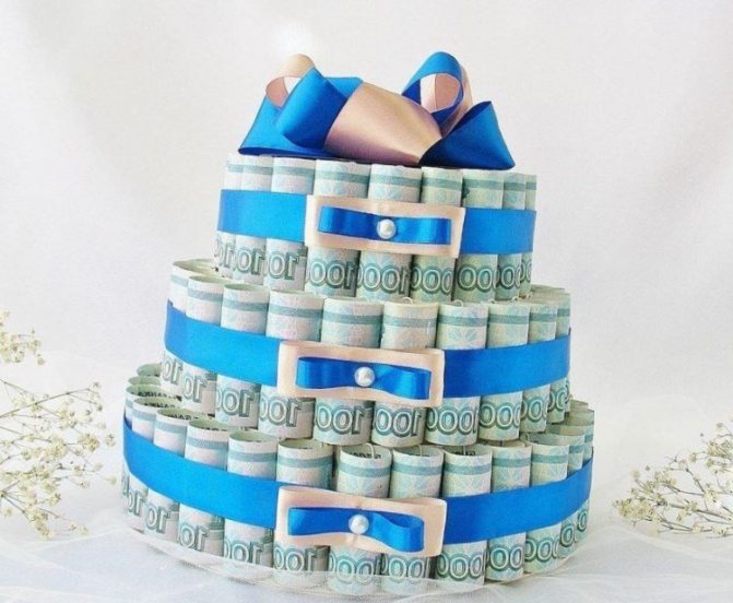 - Денежный торт. На картонные ярусы прикрепите резинками сложенные в трубочки купюры. Каждый ярус украсьте атласными лентами.