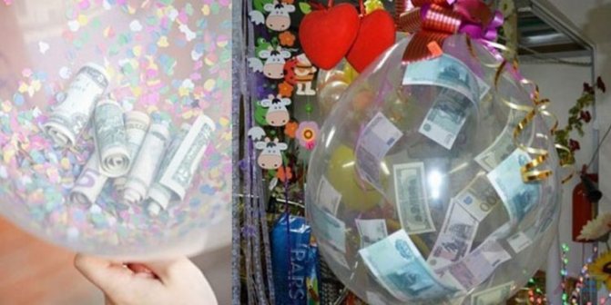 - Воздушные шарики. Засыпьте внутрь разноцветных шариков конфетти, блестки, а затем положите скрученные в трубочки и зафиксированные тонкими резинками купюры.