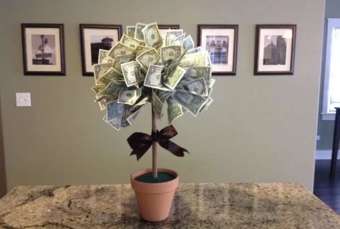 - Денежное деревце. Понадобится живое растение в вазоне, на которое подвешиваются купюры с помощью атласных ленточек.