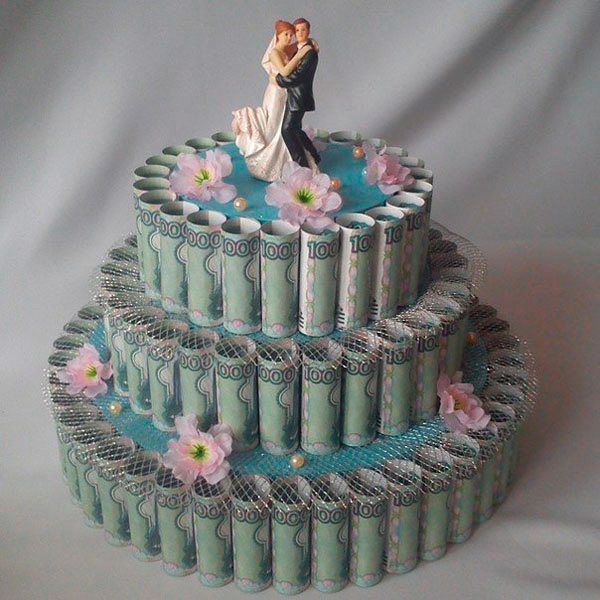 Торт из банкнот – это роскошный подарок, который сам по себе смотрится очень богато. На большой торт уйдет много купюр. Учитывая, что сумма выйдет достаточно немаленькая, можно на такой подарок скооперироваться с другими гостями, а его оформление заказать у профессионала. Если дарящие и сами мастера на все руки, нужно учесть несколько моментов. Основа для торта делается из картона. Чтобы торт смотрелся роскошно, в нем должно быть не меньше трех ярусов. На каждый ярус аккуратно крепятся купюры, свернутые в трубочку. Можно каждый ярус украсить лентами, цветами, конфетами. На верхушку крепится либо огромный красивый бант, либо цветы, либо фигурки в виде колец, сердечек, голубей или жениха и невесты. Упаковывать такой торт лучше всего в большую прозрачную пластиковую коробку, чтобы он не помялся и был виден всем.