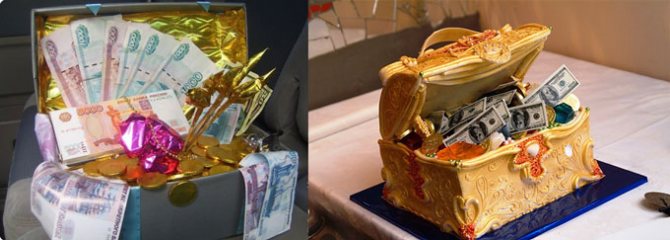 - Сундук с сокровищами. Если свадьба тематическая (например, в стиле «Пираты Карибского моря»), подарите молодым декорированный ракушками, камушками и искусственным жемчугом сундучок, внутри которого ребята обнаружат денежный сюрприз.