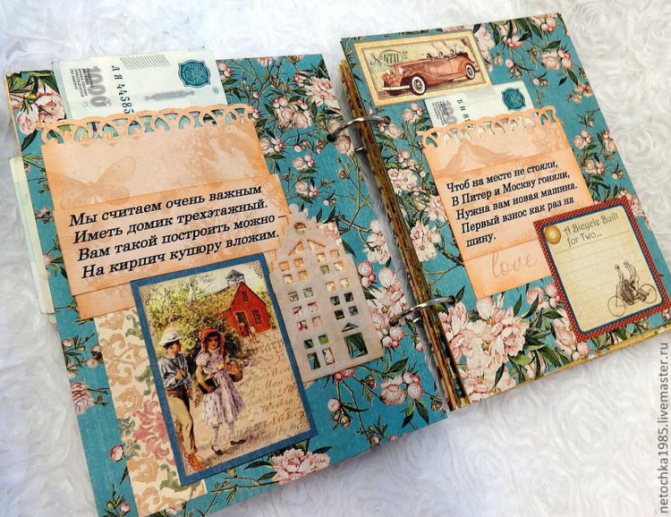 - Фотоальбом. Простой, но эффективный способ вручить деньги на свадьбу оригинально. Подберите красивый альбом, а вместо снимков положите в каждый кармашек купюру.