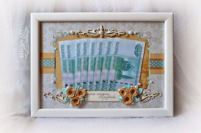 - Картина в рамке. Возьмите большую рамку для фотографии, выложите под стеклом сердце из купюр или просто раскидайте в хаотичном порядке.