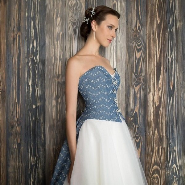 К примеру, джинсовый наряд станет изюминкой молодой пары, которая придерживается смелых решений. Подвенечное платье может полностью состоять из джинсовой ткани или частично Наряд может сочетаться с кружевными вставками, фатином, атласом и кожей.