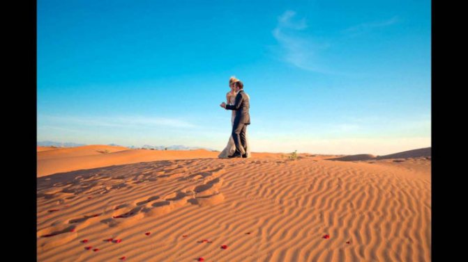 Чтобы ощутить восточный колорит, многие новобрачные сразу же после основной части мероприятия отправляются в пустыню. Фотосессия в песках на фоне заходящего солнца и бедуинских караванов обязательно оставит незабываемые впечатления. При прогулке в пустыне следует заранее позаботиться о подходящей одежде и обуви для жениха и невесты.